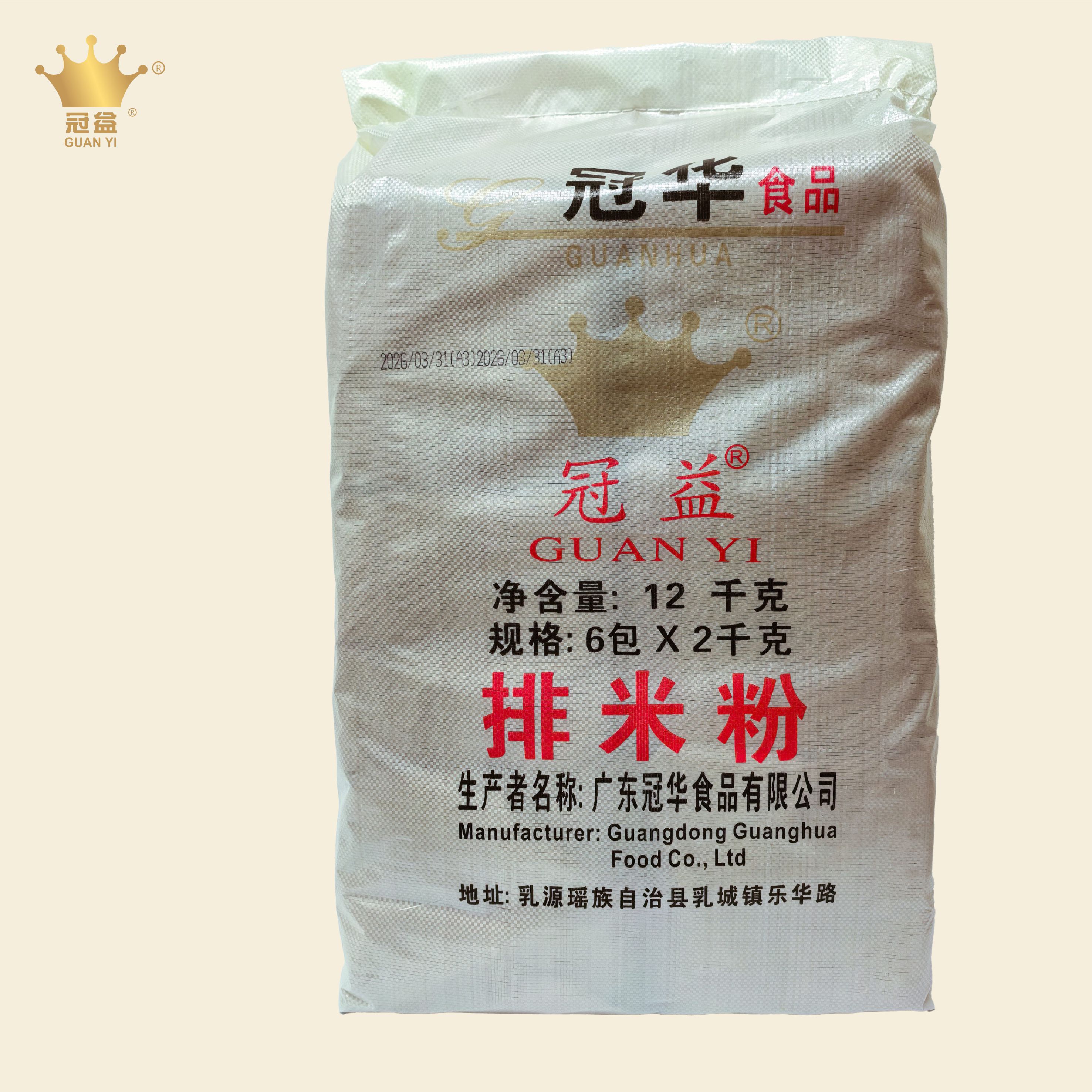 “冠益”牌排米粉在保持传统工艺的基础上,通过先进的工艺技术,选用优质稻米及乳源特有的山泉水源,经过浸、磨、滤、煮、团、烘等一系列工艺制作而成,工艺考究、细致,不含任何防腐添加剂。
