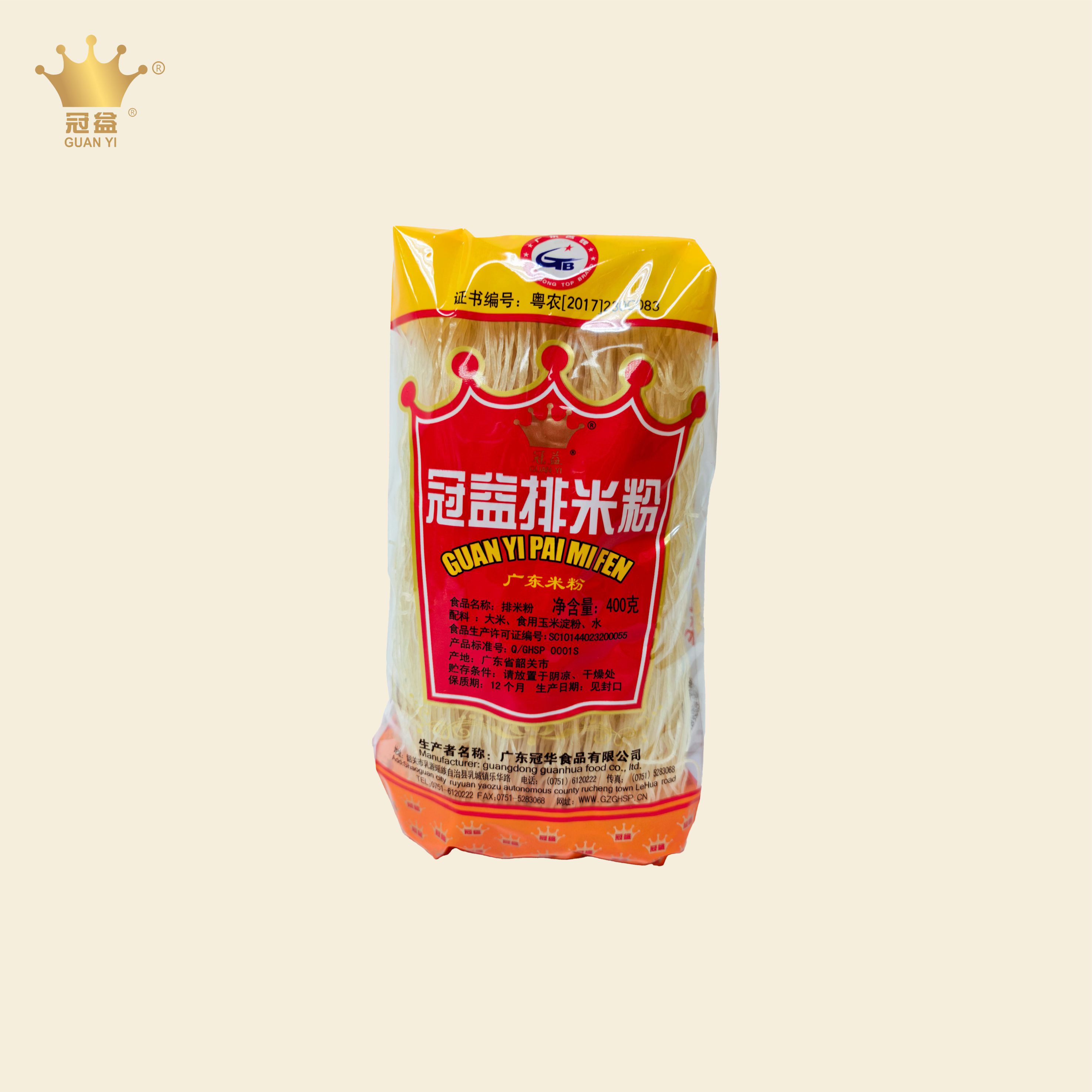 “冠益”牌排米粉在保持传统工艺的基础上,通过先进的工艺技术,选用优质稻米及乳源特有的山泉水源,经过浸、磨、滤、煮、团、烘等一系列工艺制作而成,工艺考究、细致,不含任何防腐添加剂。